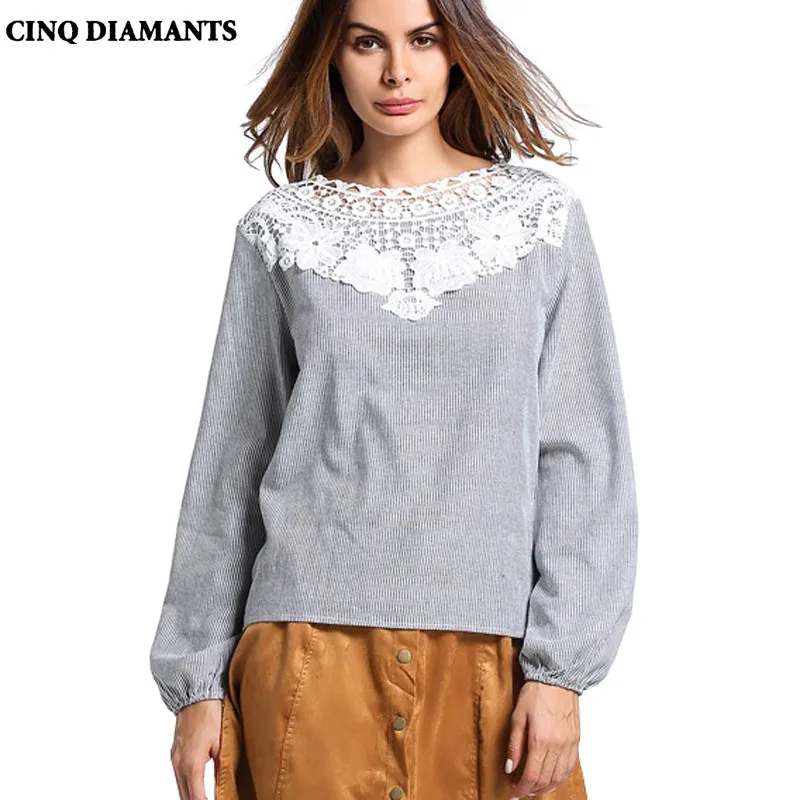 >> Immediately Click! <<CINQ DIAMANTS Women Tops Blouse Stripe Shirt White Lace Top Long Sleeve Spring Autumn Blouse Chemise Femme Ropa Mujer white-cotton-lace-top