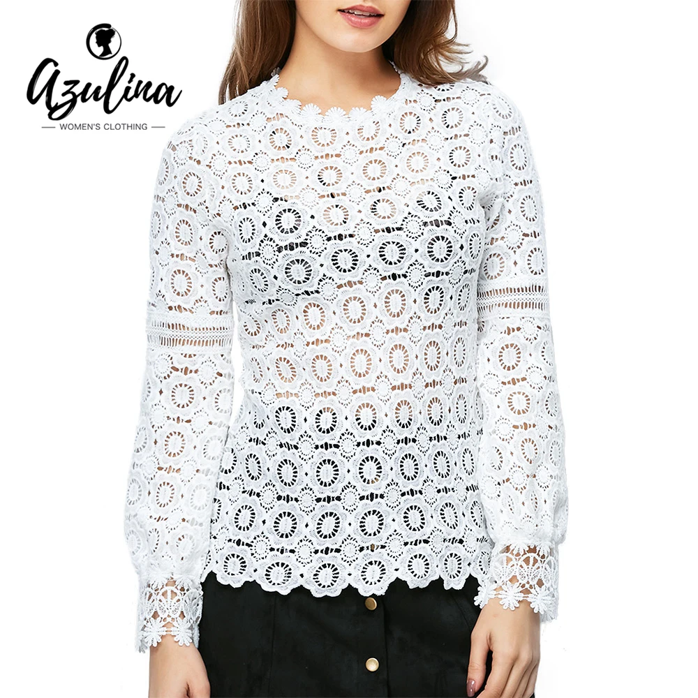 5 100 Video Reviews AZULINA Elegant floral lace blouse shirt Women lantern Long sleeve white blouse Autumn Spring hollow out short top Casual blusas white-cotton-lace-top