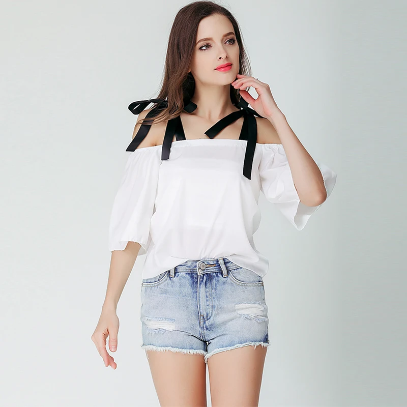 4.7 106 Video Reviews Fashion Women Summer Off Shoulder White Chiffon Blouse Elegant Bow Tie Lace Up Strap Women Tops Loose Plus Size Feminine Shirt white-cotton-lace-top