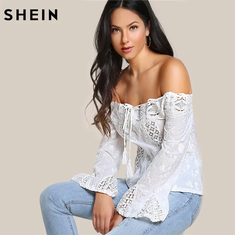 Check Price SHEIN Tassel Tie Lace Panel Embroidered Bardot Top White Off the Shoulder Tops for Women Long Sleeve Slim Blouse white-cotton-lace-top Where To Buy