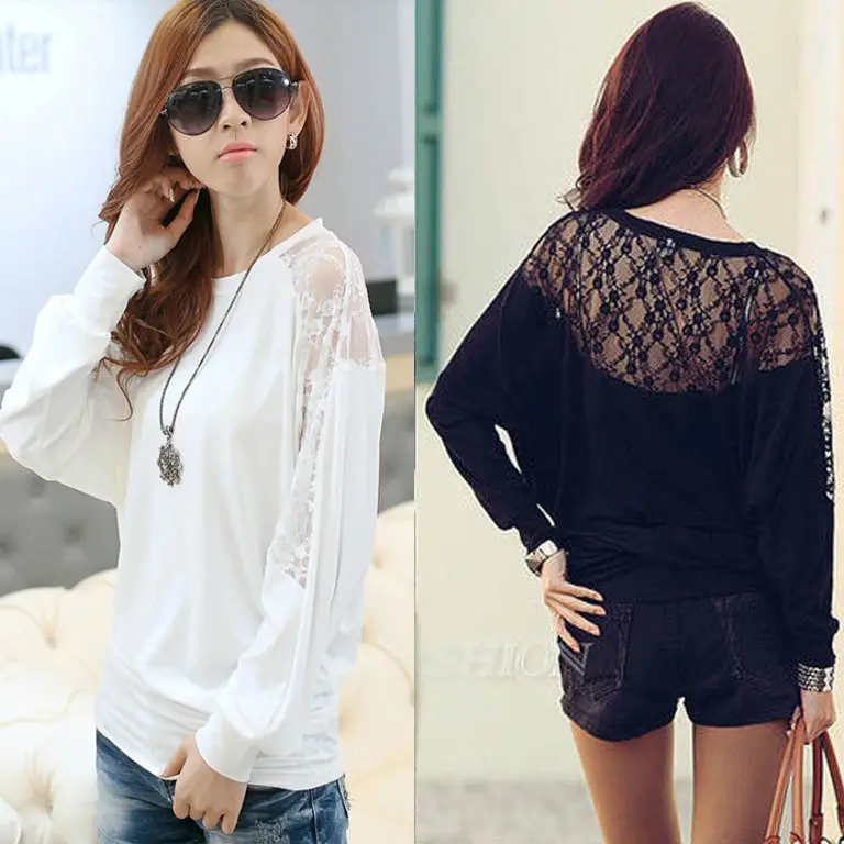 Check Price Black White Women Lady Batwing Tops Loose O-Neck Dolman Lace Long Sleeve Blouse white-cotton-lace-top Immediately