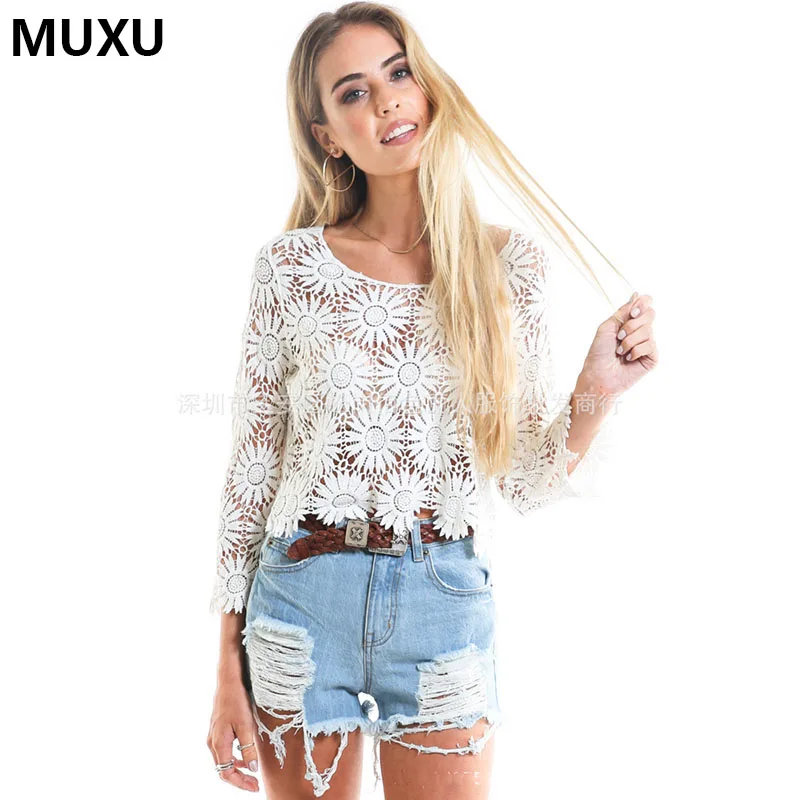 4.9 99 Video Reviews MUXU transparent crochet lace top long sleeve short white summer tops women embroidery flower ladies blouses woman blouses 2017 white-cotton-lace-top