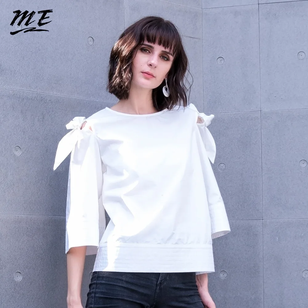 ME 2017 Elegant Women Blouse Fashion Flare Sleeve 3/4 Sleeve Loose Shirts Casual Lace Up White Streetwear Ladies Top Plus Size white-cotton-lace-top