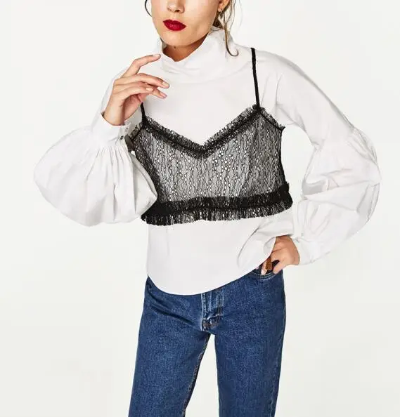 4.8 99 Video Reviews WISHBOP 2017 New Woman White TOP WITH Black LACE overlayed straps Wide high collar Long puff sleeves button cuffs Back buttoned white-cotton-lace-top
