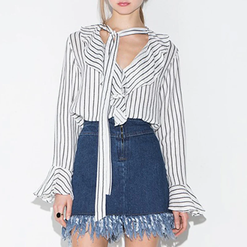 Lace Girl 2017 New Sweet Black White Striped Women Blouses Casual Ruffle Flare Sleeve V-neck Women Tops Shirt Blusas Mujer white-cotton-lace-top