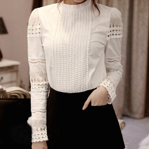 >> Tips Click! <<2017 NEW Fashion New Hot Women Long Hollow Splicing Shirt Lace Sleeve OL Tops Round Collar Blouse White white-cotton-lace-top