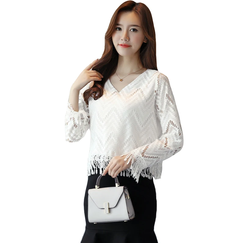 Check Price Blusas 2017 Summer Autumn Women Long Sleeve Blouse solid White Lace Blouses Hollow Out Sexy Casual Tops Shirts Plus Size 878B white-cotton-lace-top Cheap